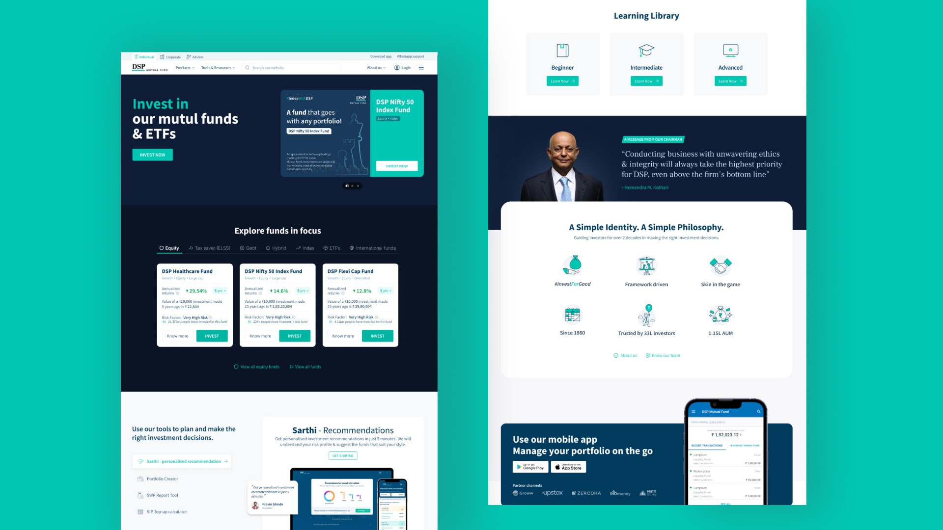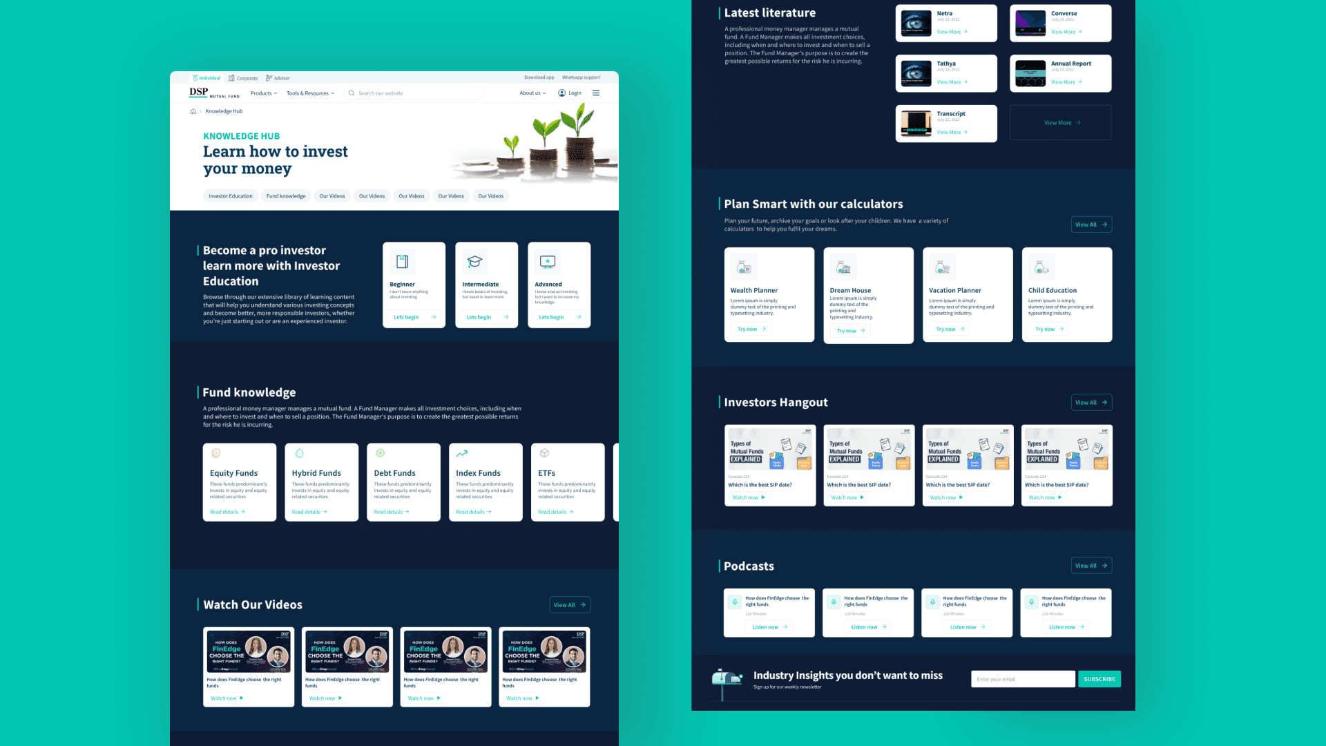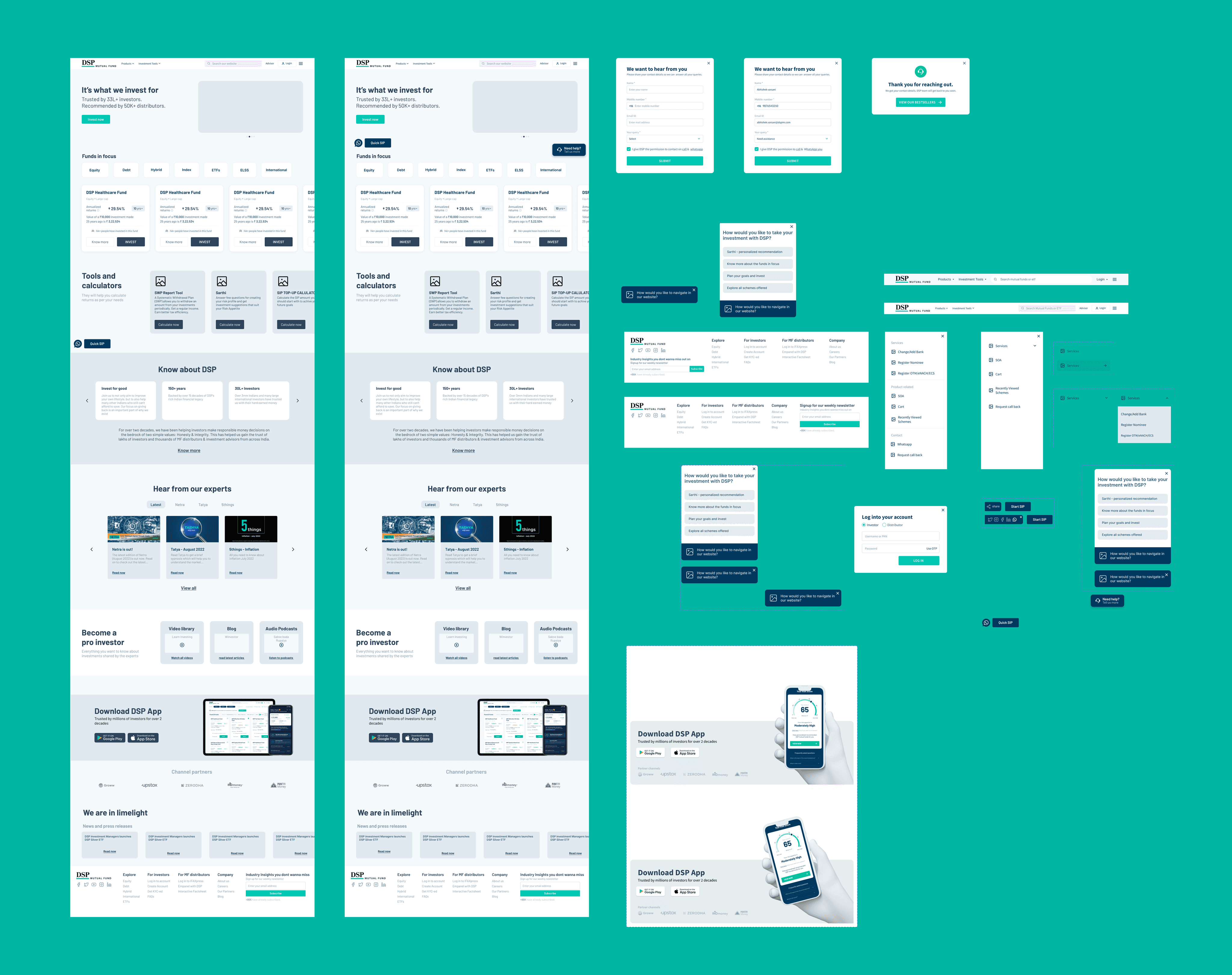 Transitioning from wireframes, the high-fidelity screens for the DSP Mutual Fund website redesign brought the design concepts to life with polished visual details and interactive elements. These screens represented a refined version of the user interface, incorporating the established style guide elements while focusing on enhancing user engagement and functionality.