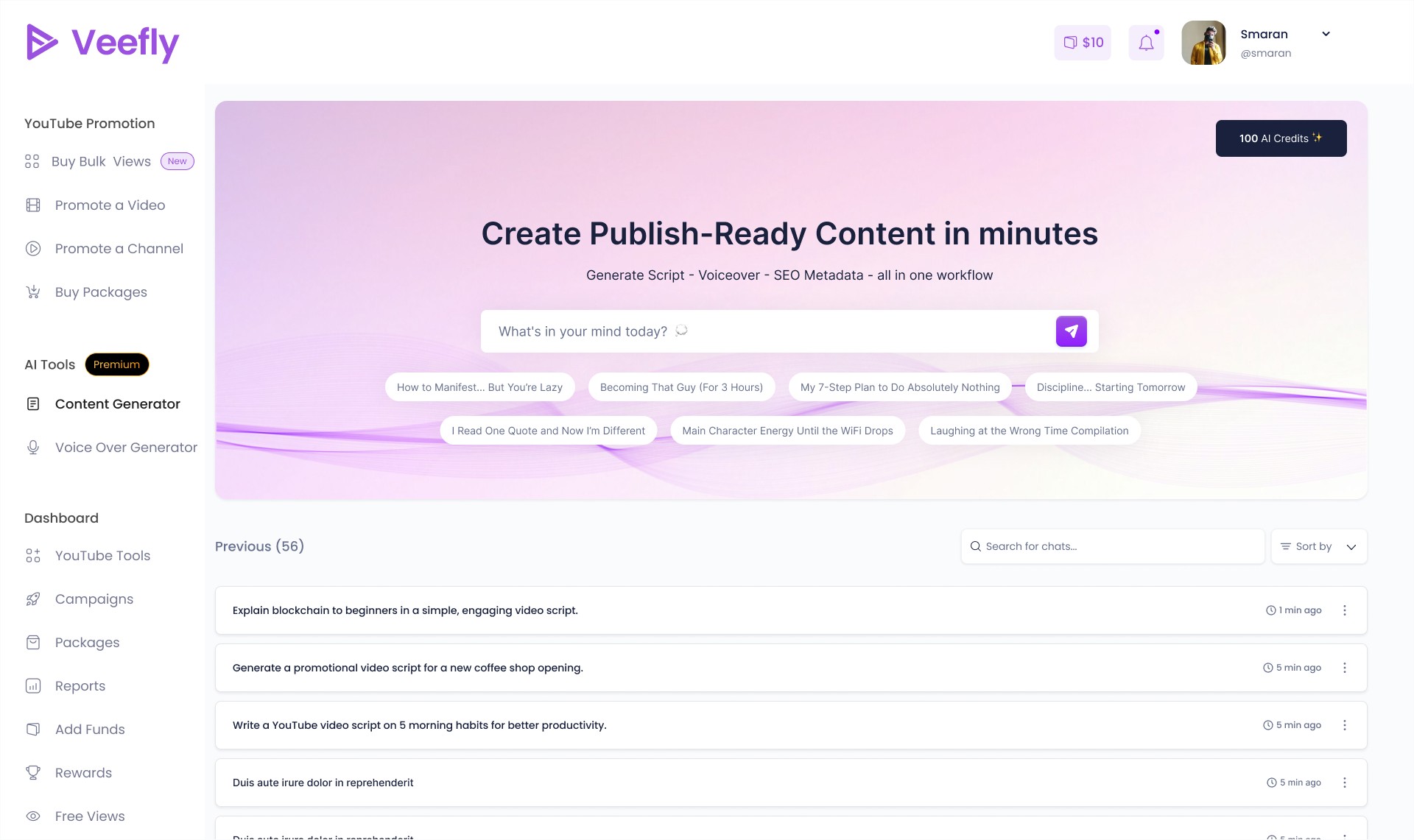 VeeFly AI was designed as a conversational AI-powered content engine that transforms a raw campaign idea into a structured, brand-aligned, publish-ready video package within minutes. Through a unified chat interface, teams can generate long-form scripts, refine narrative structures, create AI voiceovers, and produce SEO-optimized metadata—reducing tool dependency while maintaining messaging consistency across content pipelines.