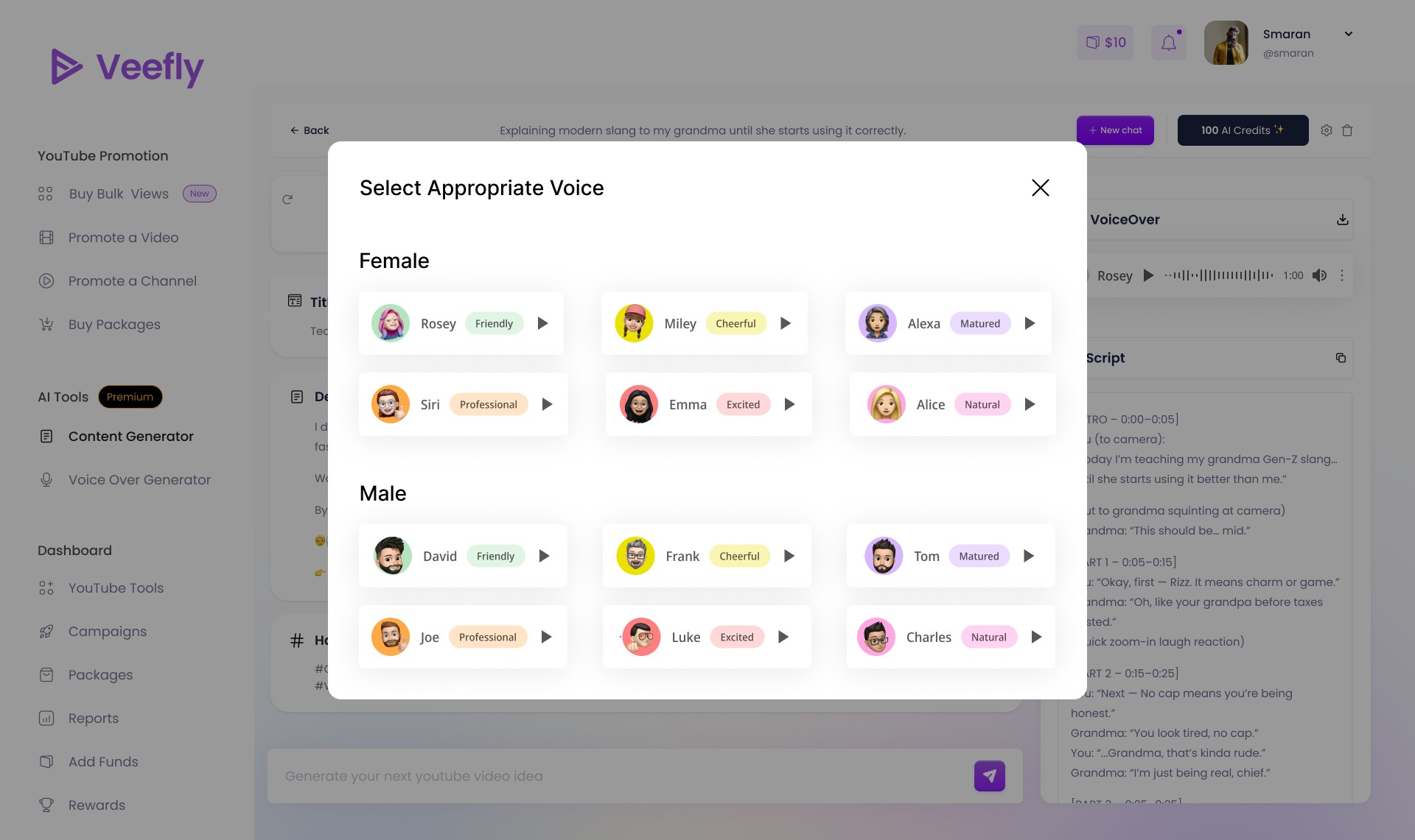 Users on VeeFly’s platform struggled to turn raw ideas into well-structured, story-driven YouTube content. Creating scripts, voiceovers, and SEO metadata required multiple tools and manual effort.
