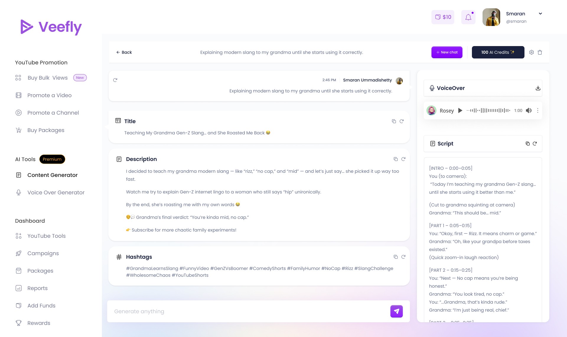 VeeFly AI transformed YouTube content creation from a fragmented, time-intensive process into a unified, AI-powered storytelling engine. By bringing scripting, narrative structuring, voice generation, and metadata optimization into a single conversational workflow, we eliminated tool-switching friction and enabled creators to move from idea to publish-ready content in minutes.